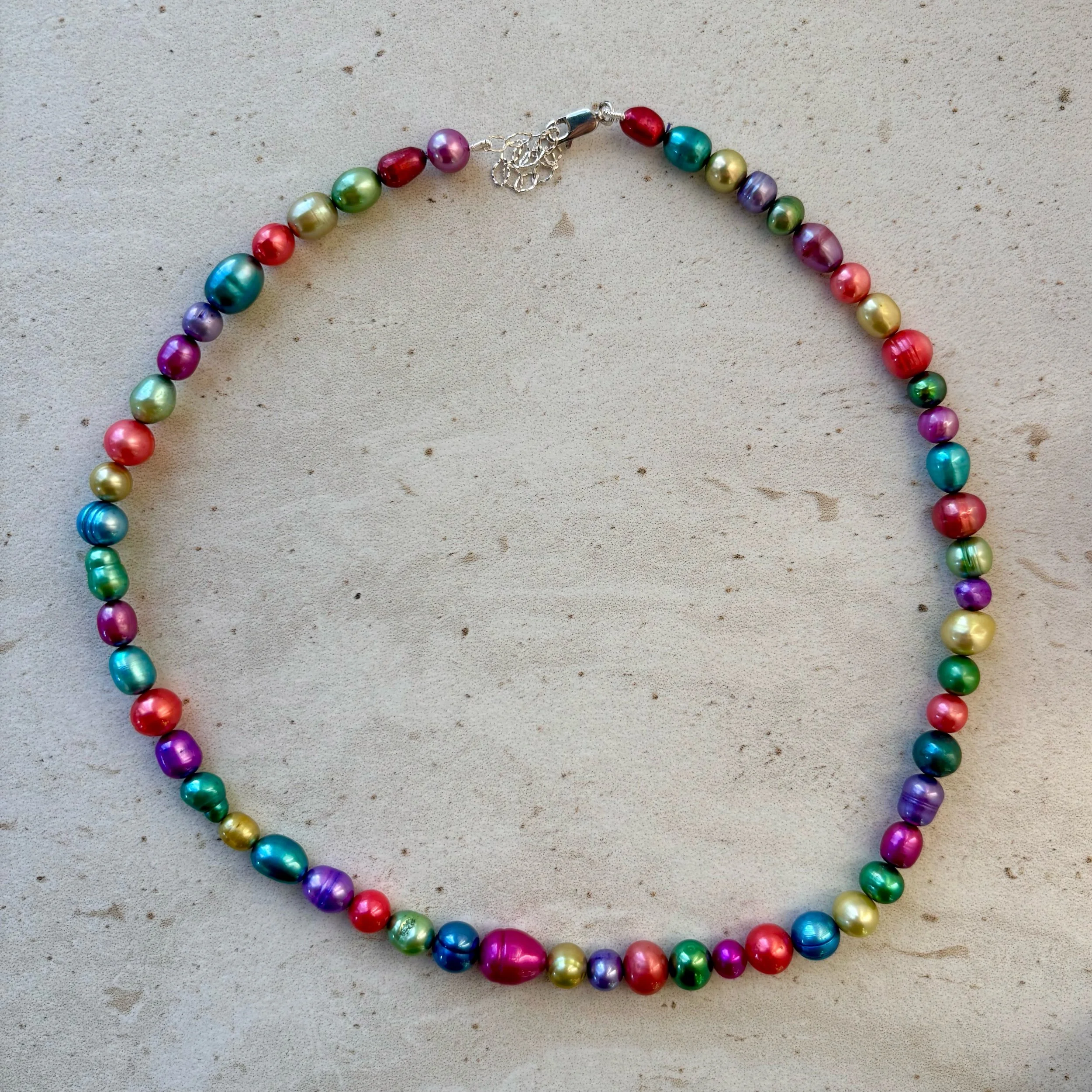The brightest, boldest pearls I own in one show stopping necklace. Made of silk thread and sterling silver clasp and chain, this adjustable necklace is 16”-18” long. Freshwater pearls. Matching earrings available.